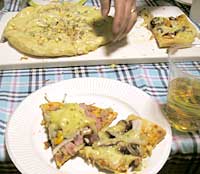 最初のピザが焼きあがり、テーブルに運ばれ、カット。