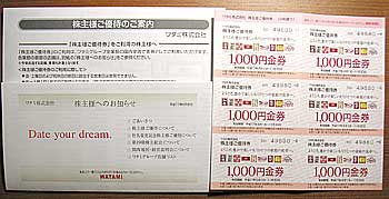 しかし、この記念1000円券は店舗でしか使えないので、うあぁ〜ゴミだよ〜勿体無〜。 本当はオークションに出したりすると、結構な値段で売れるんだけど、ワタミの社長がTVに出た時に、「売らないで」って言ってたので、やっぱり交換だ〜! オマケに「社長室行き株主様アンケートハガキ」が同封されてたので、早速ご意見を書いてポストに出してきた。儲かりマンデーで初めて見た時からワタナベ社長の大ファンです!ところが福井県にワタミがありません。この辺は居酒屋も少ないので、駐車場付きで安くておいしい居酒屋ができれば、若者は皆行きますよ!ご一考を!って(笑) あ〜、自分で6000円分+1000円のお食事券使いたいよ〜! |
