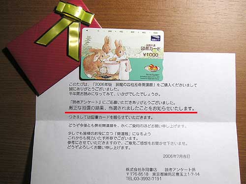 やっぱアンケートハガキは送っとくもんやねえ〜ふふふ。 図書カード1000円ゲットだぜ☆ |
