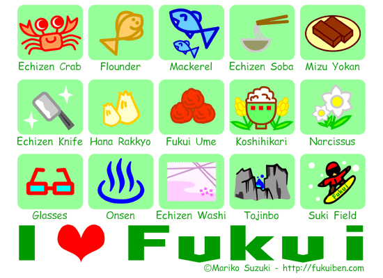 福井県を代表する「越前がに」「若狭ガレイ」「焼きさば」「越前そば」「水ようかん」「越前打刃物」「花らっきょ」「福井ウメ」「コシヒカリ」「すいせん」「メガネ」「温泉」「越前和紙」「東尋坊」「スキー場」のイラストのアイコン(英語)と共に、I Love Fukui!